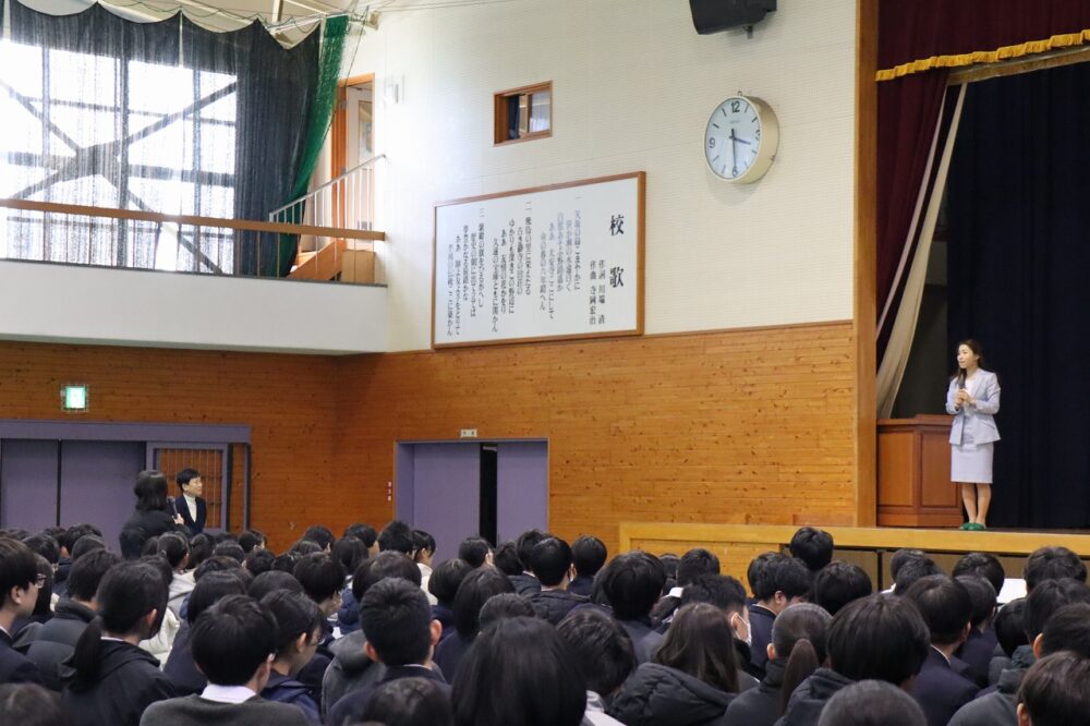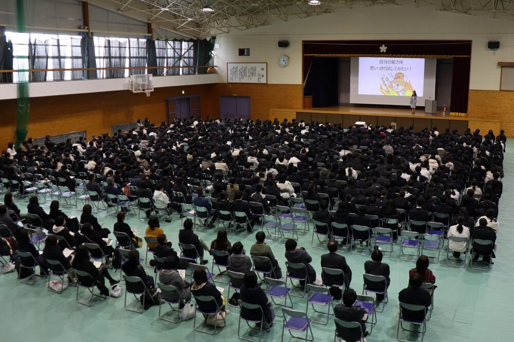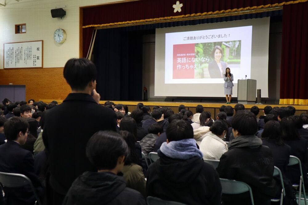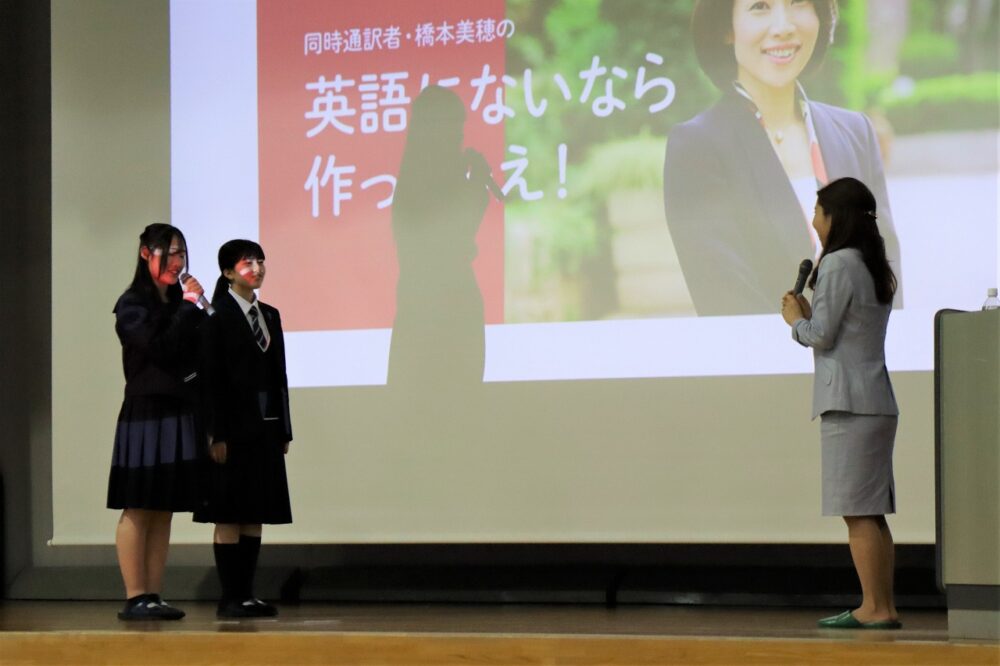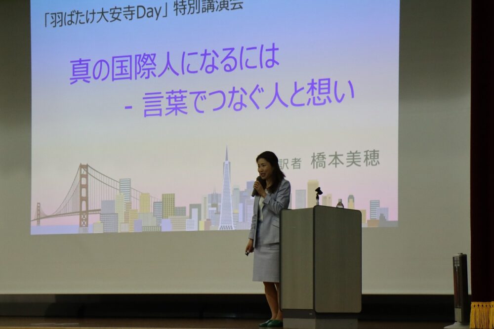 2月9日(月)14:00~15:30、本校体育館にて、1~4年生と保護者が参加して「羽ばたけ大安寺Day」特別講演会が開かれました。国際的に活躍される通訳者 橋本美穂氏を講師に招き、「真の国際人になるには ― 言葉でつなぐ人と想い」と題して講演をいただきました。アメリカと日本で育ち、通訳者として邁進されてきたご経験を惜しむことなく、飾らないお人柄でお話しされる言葉は生徒の心にまっすぐ響いて最高の講演会になりました。通訳の極意に引き込まれるとともに、「学ぶ」ということ、自分や仕事との向き合い方に新しい気づきがあり、生徒が未来に羽ばたく力を得ることができました。