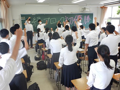 1学期期末考査が終わり、白鷺祭結団式を全校で実施しました。今年は、例年と違い、6年生が各ブロック(黄・緑・青)のクラスに行ったり、MEET(赤ブロック)で責任者等の紹介や説明等を行いました。
