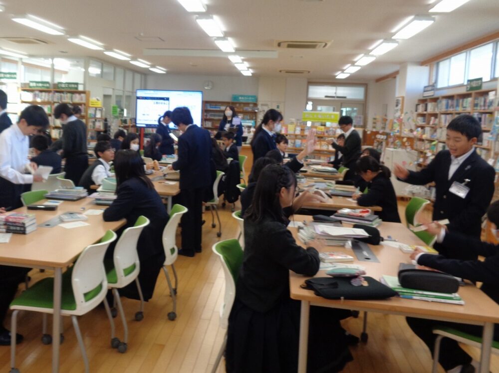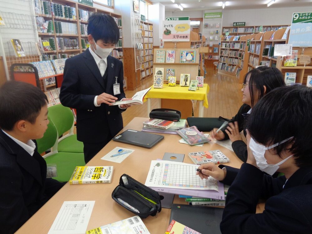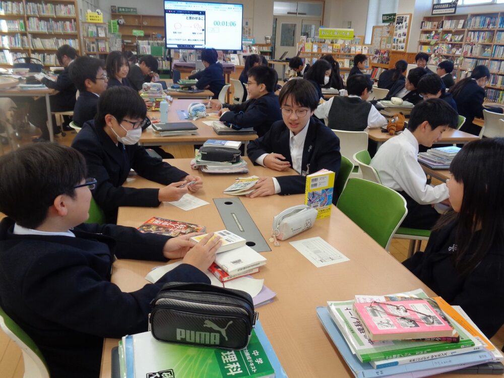 1月14日(水)、1年生が国語Aの時間に図書館でビブリオバトルを行いました。班に分かれて、生徒たちはお気に入りの本を紹介し、誰の本が読みたいかを決めました。