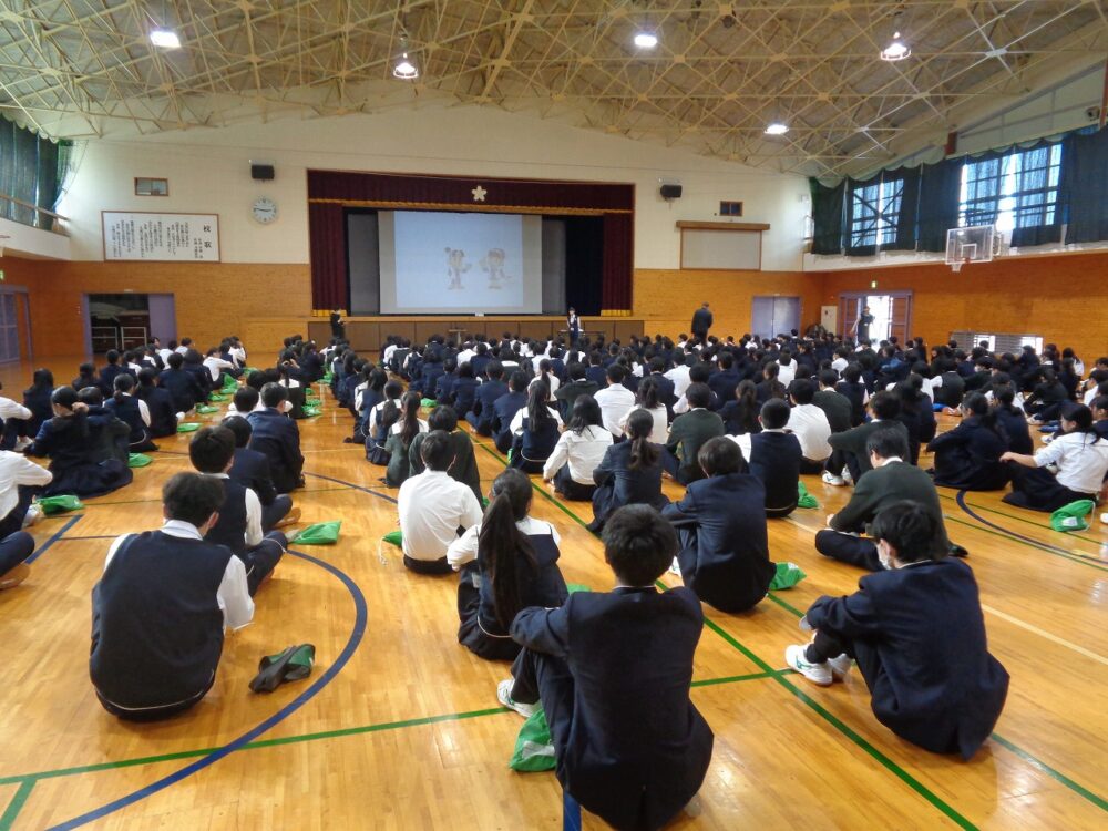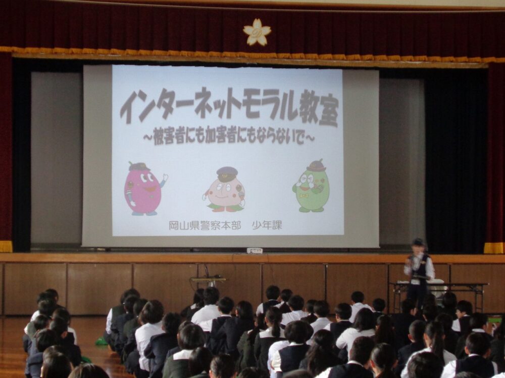 11月7日(金)の7限に、1年・3年生対象でインターネットモラル教室を行いました。岡山県警察本部の少年課から長谷様にお越しいただき、インターネット利用に潜む危険や、安全に利用するために注意してほしいことを、具体的な例を挙げながらとてもわかりやすく講義していただきました。ありがとうございました。