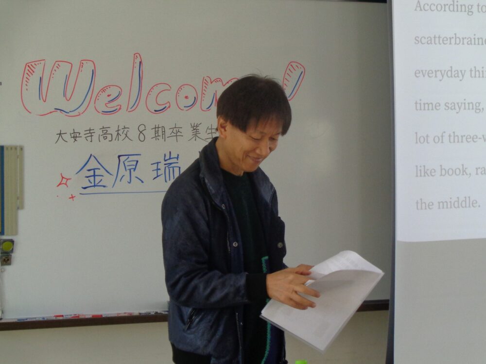 あらかじめ金原先生から出されていた宿題や質問に生徒が答え、それについて金原先生から講評を頂く形で進めました。先生からは、英語の授業は翻訳するつもりで臨むと面白く受けることができることなど、様々な示唆を得ることができました。英語学習へのモチベーションが高まっただけではなく、「日本語の豊かさにも気付きました」との生徒の感想もあり、忘れられない貴重な体験になりました。