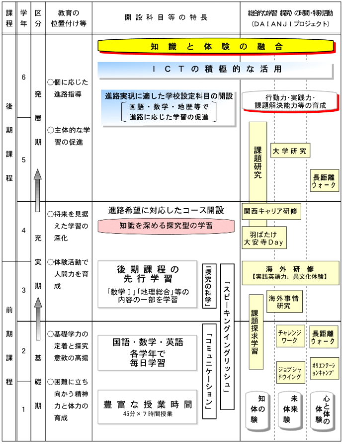 6年間を見通した系統的な学習が一層可能になる新しい形態の学校です。中学校過程3年間と高等学校過程3年間を分断することなく、中学校課程に入学した生徒が全員、高等学校課程に進んでいきます。高等学校課程への外部からの入学はありません。